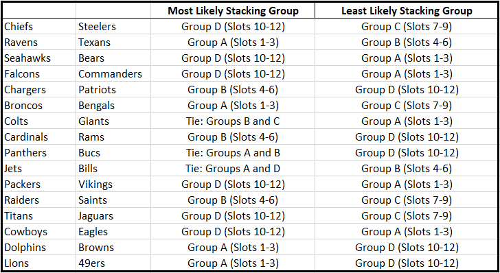 USING ADP TO PREDICT WHICH DRAFT SLOTS ARE MORE LIKELY TO STACK WHICH GAMES