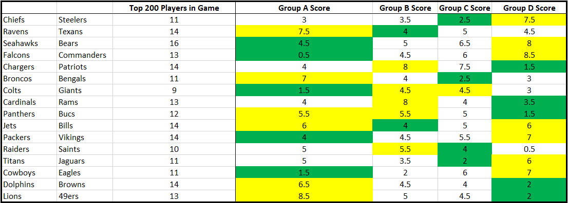 From there, it was all very simple. I correlated which draft pick slot Groups selected the most (and fewest) players from each respective Week 17 game.