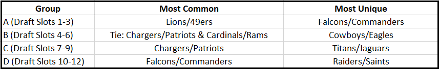 Below is a different presentation of the data. This is best used if you’re on the clock and need a quick look at which game stacks are most or least likely based on where you’re drafting from. A reminder: the terms “Common” and “Unique” are used for clarity. These stacks will not necessarily be the ones most commonly built by these draft groups, but they are the likely (and least likely) stacks to be built, based on ADP: