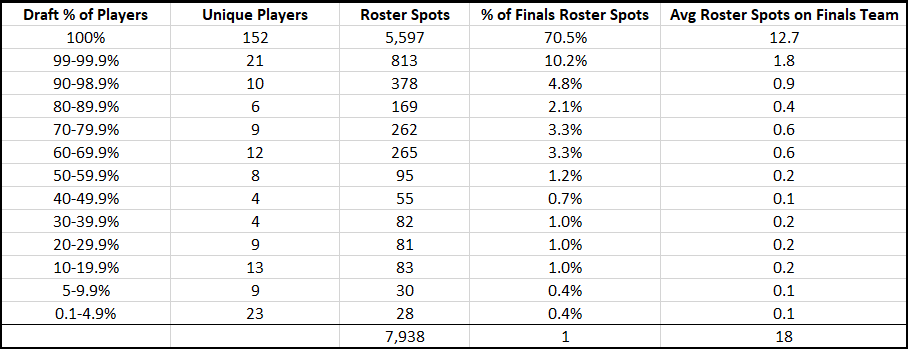 One other note on unique rosters: obviously, the ideal scenario is getting a team through to the finals and having an active player on your roster that was drafted a ton (even 100%), but is on a low percentage of your opponents’ rosters. The most common cause of this is, of course, a star playing getting injured during the season and returning for the fantasy playoffs.