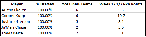 Week 17 didn’t go well for these players, and this isn’t a scenario you can plan for. That said, it is a reminder that a unique roster in the finals of a large tournament can often come from random, unexpected circumstances. In other words, the best strategy is probably to just draft the best team you can. There are now relatively proven, effective strategies that can lead to an edge over even a large field, but sometimes the game is just random. In these cases, it’s usually better to have one of just 2 finals teams rostering Ja’Marr Chase than it is to have one of just 2 teams rostering Trent Sherfield.